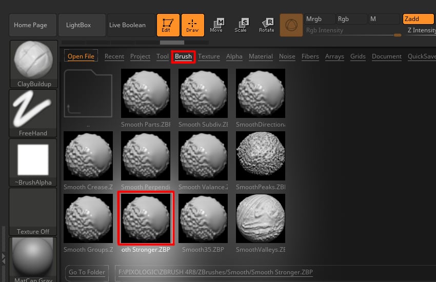 Press Comma key on the keyboard for Lightbox, then select brush from the Bar > Smooth folder and double click on Smooth Stronger.